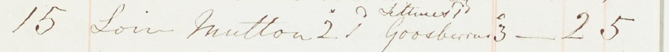 So on the whole line you have Loin Mutton 2s. 1d. Gooseberries 3d. Lettuces 1d. and you can confirm this because they add up to the 2s. 5d. shown in the right hand column.